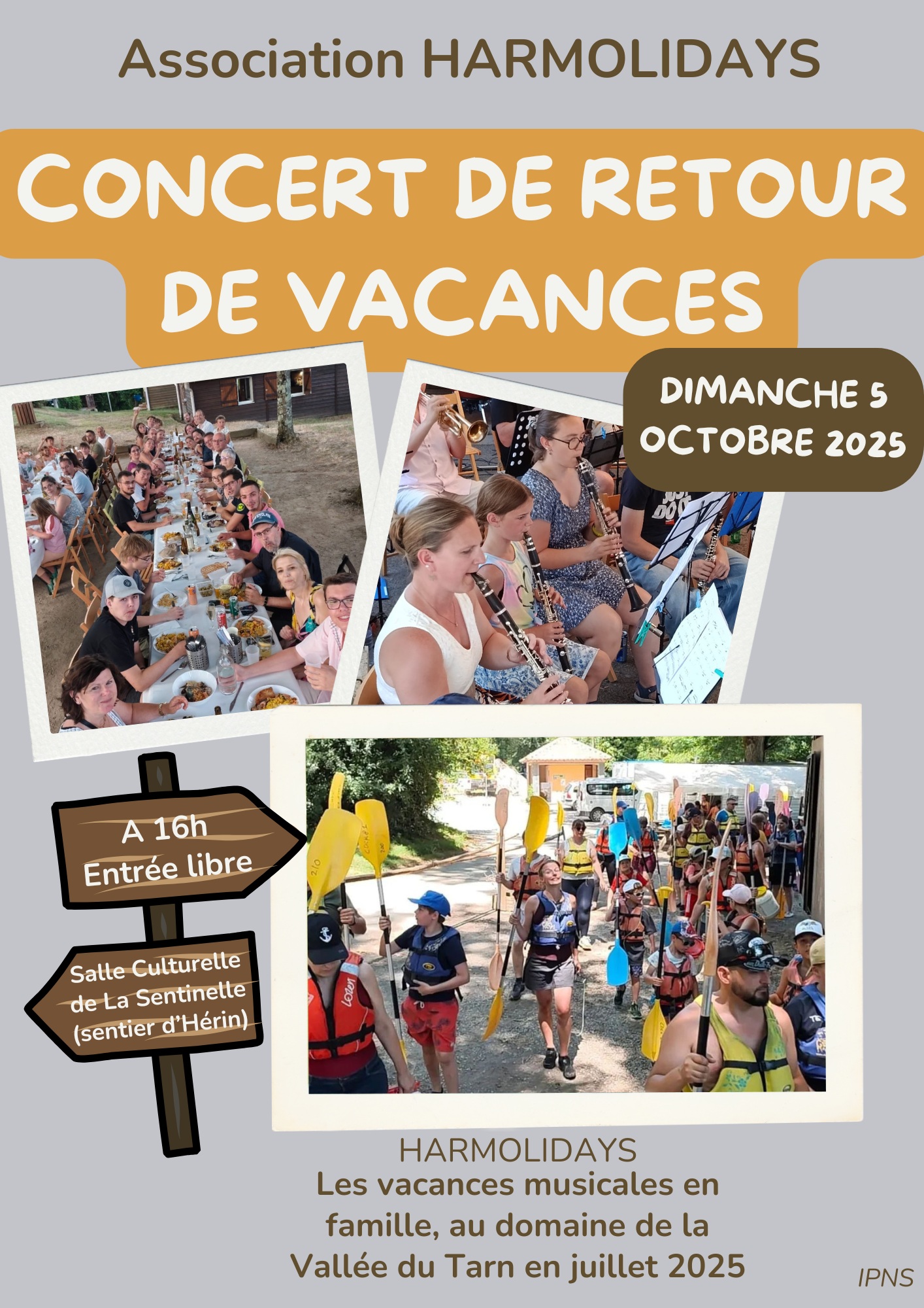 L’association 𝗛𝗔𝗥𝗠𝗢𝗟𝗜𝗗𝗔𝗬𝗦 vous invite à son 𝗰𝗼𝗻𝗰𝗲𝗿𝘁 𝗱𝗲 𝗿𝗲𝘁𝗼𝘂𝗿 𝗱𝗲 𝘃𝗮𝗰𝗮𝗻𝗰𝗲𝘀. L’occasion de retrouver l’ambiance conviviale et musicale des 𝘃𝗮𝗰𝗮𝗻𝗰𝗲𝘀 𝗳𝗮𝗺𝗶𝗹𝗶𝗮𝗹𝗲𝘀 𝗮𝘂 𝗱𝗼𝗺𝗮𝗶𝗻𝗲 𝗱𝗲 𝗹𝗮 𝗩𝗮𝗹𝗹𝗲́𝗲 𝗱𝘂 𝗧𝗮𝗿𝗻, vécues en juillet 2025.