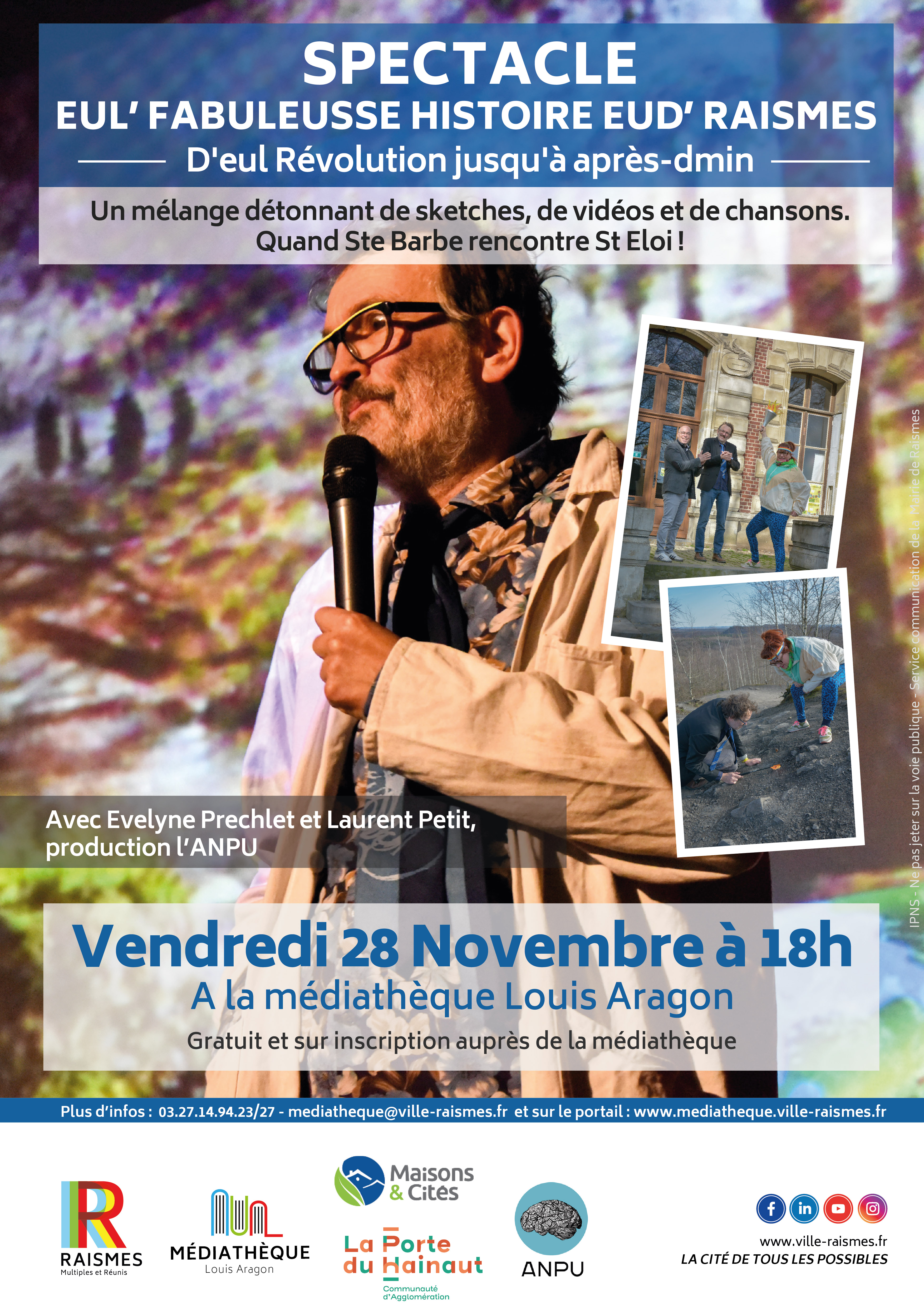 Le célèbre “psychologue urbain” 𝗟𝗮𝘂𝗿𝗲𝗻𝘁 𝗣𝗲𝘁𝗶𝘁, accompagné de l’incontournable 𝗘𝘃𝗲𝗹𝘆𝗻𝗲 𝗣𝗿𝗲𝗰𝗵𝗹𝗲𝘁, revient pour la dernière étape de son spectacle consacré à l’Histoire de Raismes.