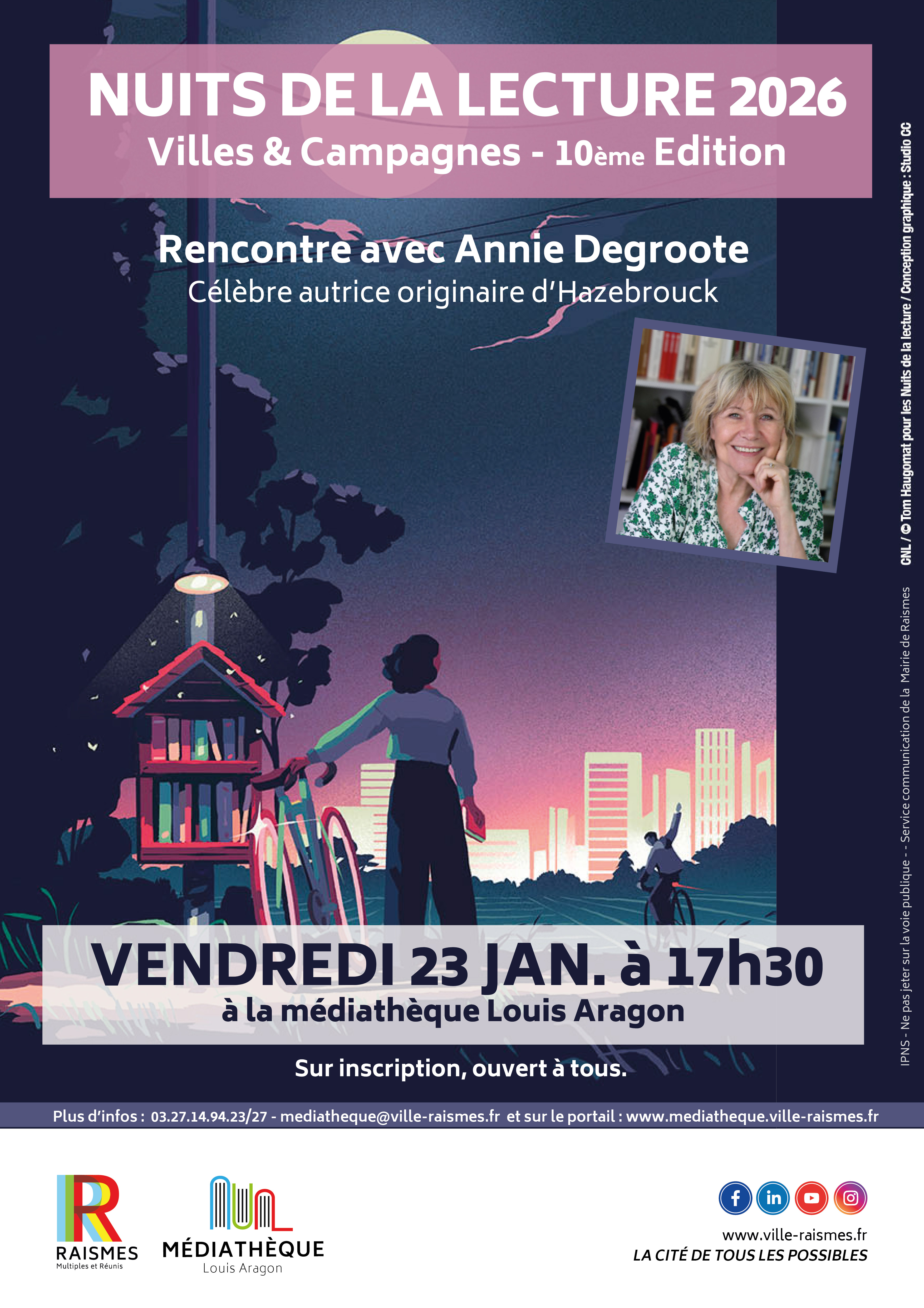 Dans le cadre des 𝗡𝘂𝗶𝘁𝘀 𝗱𝗲 𝗹𝗮 𝗟𝗲𝗰𝘁𝘂𝗿𝗲 𝟮𝟬𝟮𝟲, la médiathèque de Raismes vous propose une rencontre avec 𝗔𝗻𝗻𝗶𝗲 𝗗𝗲𝗴𝗿𝗼𝗼𝘁𝗲, autrice reconnue originaire d’Hazebrouck.