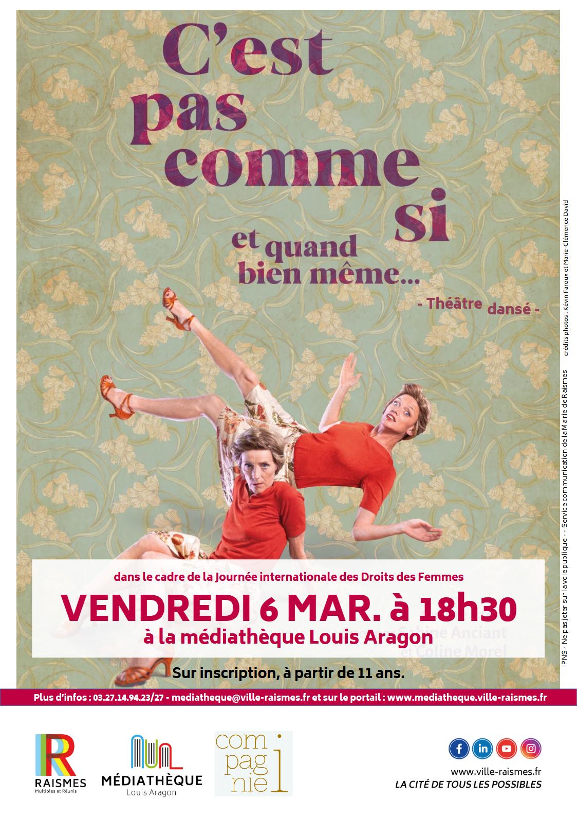 À l’occasion de la 𝗝𝗼𝘂𝗿𝗻𝗲́𝗲 𝗶𝗻𝘁𝗲𝗿𝗻𝗮𝘁𝗶𝗼𝗻𝗮𝗹𝗲 𝗱𝗲𝘀 𝗱𝗿𝗼𝗶𝘁𝘀 𝗱𝗲𝘀 𝗳𝗲𝗺𝗺𝗲𝘀, la 𝗺𝗲́𝗱𝗶𝗮𝘁𝗵𝗲̀𝗾𝘂𝗲 𝗟𝗼𝘂𝗶𝘀 𝗔𝗿𝗮𝗴𝗼𝗻 𝗱𝗲 𝗥𝗮𝗶𝘀𝗺𝗲𝘀 vous propose le spectacle « 𝗖’𝗲𝘀𝘁 𝗽𝗮𝘀 𝗰𝗼𝗺𝗺𝗲 𝘀𝗶 » de Sabine Anciant et Coline Morel.
